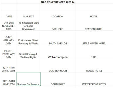 NAC national meetings and conferences are arranged by Cllr Brian Nelson, the NAC National